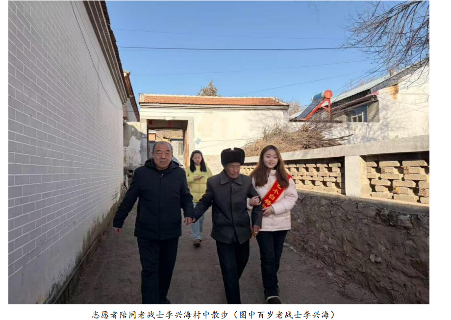 1 月 20 日清晨,冬日的涞源寒意正浓,但西庄铺村的李兴海老人家中却暖意融融。汪 心宇带领 7 名同学,带着精心准备的慰问品,在汪爷爷的陪同下,准时来到老人家中。 今年 103 岁的李兴海老人,是一位身经百战的老英雄,隶属于中国人民解放军 64 军 191 师 572 团,先后参加过解放忻州、太原、北京的战斗。抗美援朝战争爆发后,他响应 国家号召,跨过鸭绿江,奔赴朝鲜战场,先后参与了多次重大战役。退役后,李兴海老人 毅然回到家乡西庄铺村,扎根乡村、默默奉献,用勤劳的双手建设家园,从不提及自己的 战功,将毕生精力都献给了国家和人民。如今,老人虽已年过百岁,但精神矍铄,谈及当 年的战斗经历,依旧眼神坚定、语气铿锵,仿佛又回到了那个烽火连天的岁月。